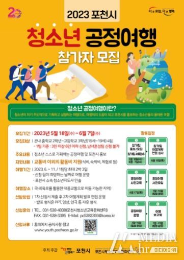 미디어아워 박미영 기자 | 포천시는 관내 청소년들의 긍정적인 여가 선용을 위해 자기 주도적으로 여행을 기획해 여행지에 도움을 주고 포천시를 홍보하는 ‘2023년 포천시 청소년 공정여행’ 참가 청소년을 모집한다.