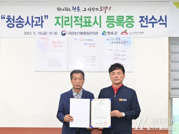미디어아워 조연정 기자 | 청송군은 지난 5월 19일 군청 소회의실에서 윤경희 청송군수, 김정우 청송사과협회장, 국립농산물품질관리원 관계자 등이 참석한 가운데 “청송사과” 지리적표시 등록증 전수식을 가졌다.