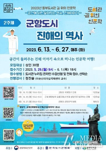 강좌는 6월 13일부터 6월 27일까지 매주 화요일 10시~12시(탐방: 6월 27일 9시~15시) 총 3회 운영되며, 수강료 및 탐방료는 무료이다. 특히 2주제 탐방코스인 ‘군항문화탐방’은 진해에서 군부대를 탐방할 수 있는 국내 유일의 영내탐방 관광으로 해군사관학교 내 군항유적, 거북선, 故 이승만 대통령 별장 등을 둘러볼 수 있다. 강연과 탐방, 독서가 연계된 ‘길 위의 인문학’을 통해 군항도시로서의 진해를 알아가는 뜻깊은 시간이 될 것이다.