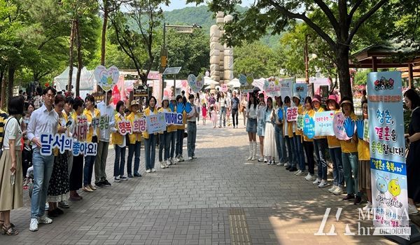 이날 캠페인은 오후 2시 이곡장미공원 출입구에서 청년이 주도적으로 앞장 서 “청년, 결혼을 응원합니다.” “결혼은 축복이다.” 등 피켓을 활용한 이색적인 퍼포먼스를 시작으로 진행됐다.