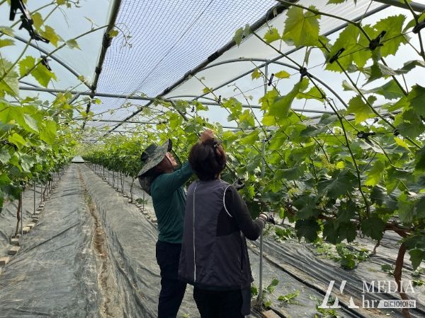 감문면 행정복지센터 직원 9명은 이른 아침부터 모여 농장주에 포도 순 따는 방법을 간략히 배운 후 서툰 솜씨이지만 농가에 도움이 되고자 하는 마음으로 작업에 몰두했다.