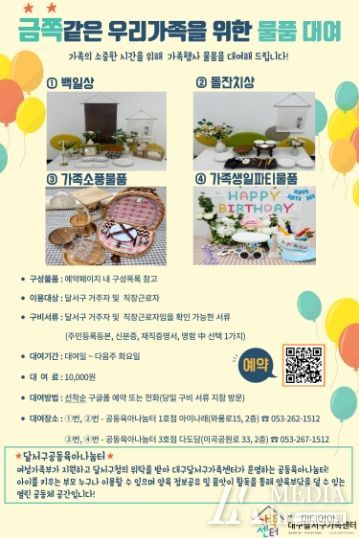 미디어아워 조연정 기자 | 대구 달서구는 달서구가족센터에서 달서구 지역주민을 대상으로 가족소풍·생일파티물품 등을 대여해 주는‘금쪽같은 우리가족을 위한 물품대여’사업을 운영 중 이라고 밝혔다