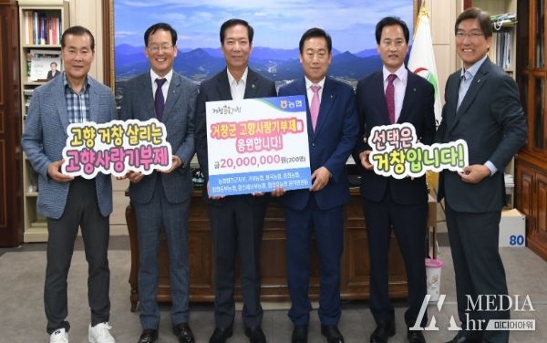 미디어아워 조연정 기자 | 거창군은 25일 거창군 4개 농·축협(거창농협, 동거창농협, 남거창농협, 거창축협)과 합천 7개 농협(농협 합천군지부, 가야농협, 율곡농협, 합천농협, 합천동부농협, 합천새남부농협, 합천호농협) 임직원 400여 명이 고향사랑기부제 활성화와 두 지역의 상생발전을 응원하며 각각 2000만 원을 상호 기부했다고 밝혔다.