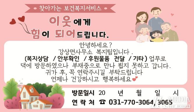 미디어아워 진금하 기자 | 양평군 강상면은 지난 22일부터 복지 사각지대 발굴과 고독사 방지를 위한 가정방문 알림스티커를 제작해 복지 분야에서 적극 행정을 펼치고 있다.