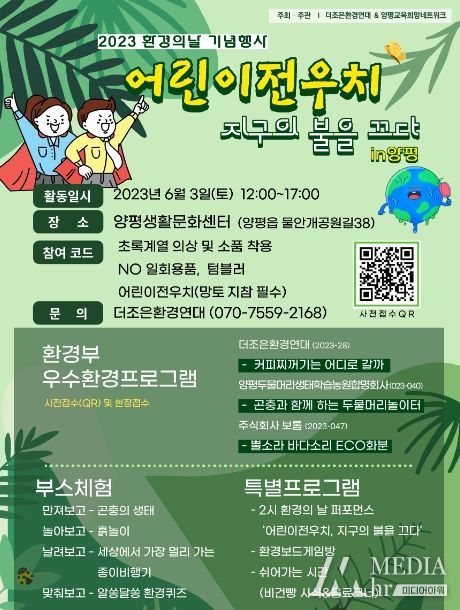 또 같은 날 낮 12시부터 양평생활문화센터에서 ‘어린이전우치 지구의 불을 끄다’라는 주제로 올해 우수 환경교육프로그램으로 선정된, 재활용교육과 함께 어린이와 청소년을 대상으로 한 생태교육과 퀴즈 게임을 비롯한 다양한 이벤트가 진행될 예정이다.