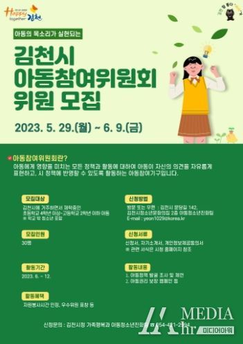 미디어아워 조연정 기자 | 김천시는 5월 29일부터 6월 9일까지 아동의 참여권 증진과 실현을 위해 ‘아동 참여위원회’위원 30명을 모집한다.