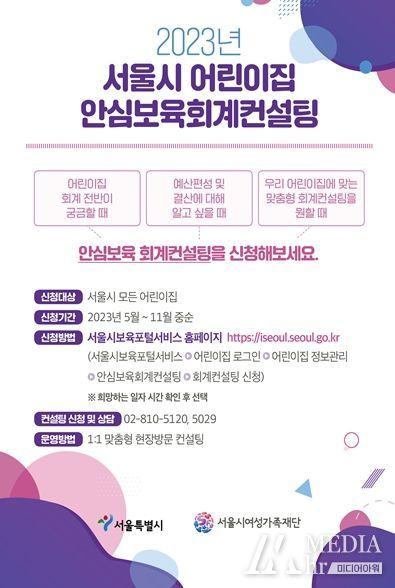 미디어아워 조연정 기자 | 서울시는 서울시 내 780개 어린이집을 대상으로 전문 컨설턴트가 어린이집을 직접 방문해서 막막하고 어려운 회계 운영 전반에 대해 무료 컨설팅을 해주는 ‘안심보육 회계컨설팅’을 실시한다.