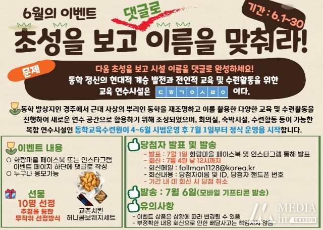 미디어아워 조연정 기자 | 화랑마을은 정식운영을 앞둔 동학교육수련원의 홍보를 위해 6월 한달간 초성이벤트를 실시한다.