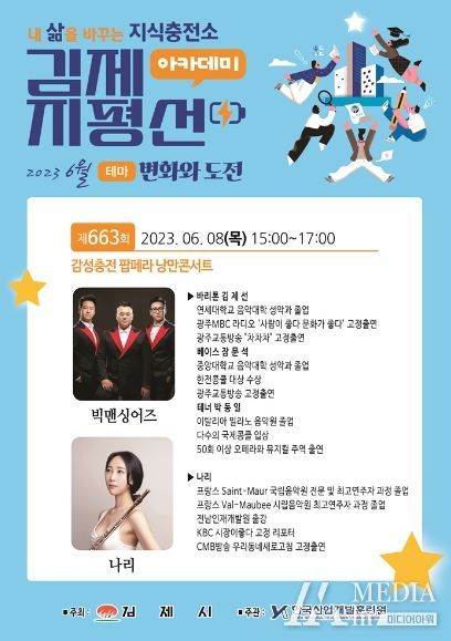 미디어아워 조연정 기자 | 김제시는 6월 8일 제663회 지평선아카데미에 빅맨싱어즈&나리를 초청하여‘감성충전 팝페라 낭만콘서트’라는 주제로 진행할 예정이다.