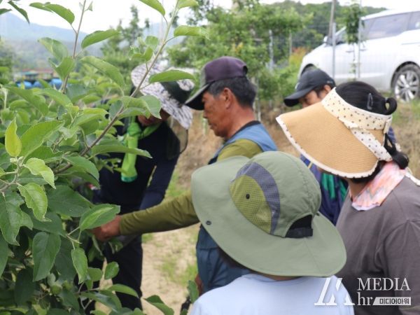봉사에 앞서 작목 담당자로부터 사과 열매솎기 방법 및 주의사항을 전달받는 등 작업내용을 사전에 숙지한 후 현장에 나섰다.
