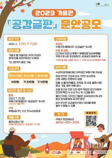 미디어아워 조연정 기자 | 부평구가 오는 7일부터 다음달 7일까지 한 달간 ‘2023년 가을편 공감글판’ 문안을 공모한다.