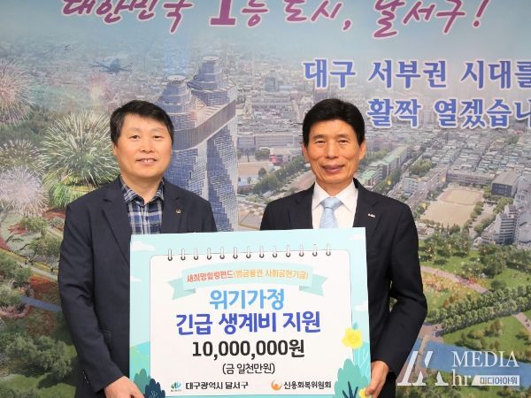 미디어아워 조연정 기자 | 대구 달서구는 7일 신용회복위원회 대구·경북 지역단에서 달서구 저소득 위기가정을 위한“새희망힐링펀드 긴급생계비 후원금(금일천만원)”을 기탁했다고 밝혔다.