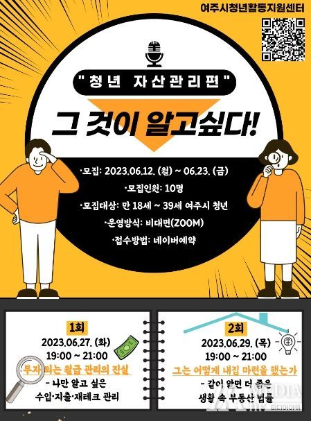 미디어아워 기자 | 여주시 청년활동지원센터는 6월, 여주시 청년들을 위한 ‘그것이 알고 싶다, 청년자산관리’ 프로그램을 진행한다고 밝혔다.