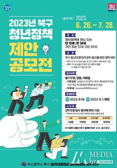 미디어아워 기자 | 부산 북구는 청년층의 구정 참여를 확대하고 청년들에게 실질적으로 필요한 정책을 발굴하기 위해 ‘2023년 청년정책 제안 공모전’을 개최한다고 14일 밝혔다.