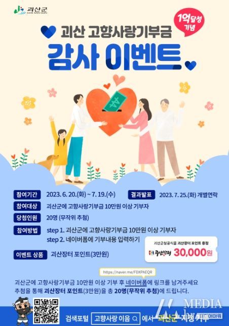 미디어아워 기자 | 충북 괴산군은 다음달 19일까지 고향사랑기부금 1억원 달성을 기념하는 감사 이벤트를 진행한다고 밝혔다.