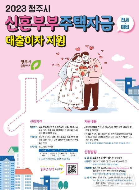 지원 대상은 주택자금을 대출한 신혼부부(혼인신고일 기준 7년 이내)로, 부부 모두 2022년 7월 3일 이전부터 청주시에 주소를 두고 있어야 한다.