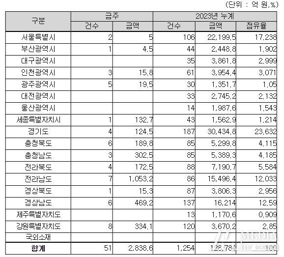 지역별로는 전라남도 1,053억 원, 경상남도 469억 원, 강원특별자치도 334억 원, 그 밖의 지역이 983억 원이다.
