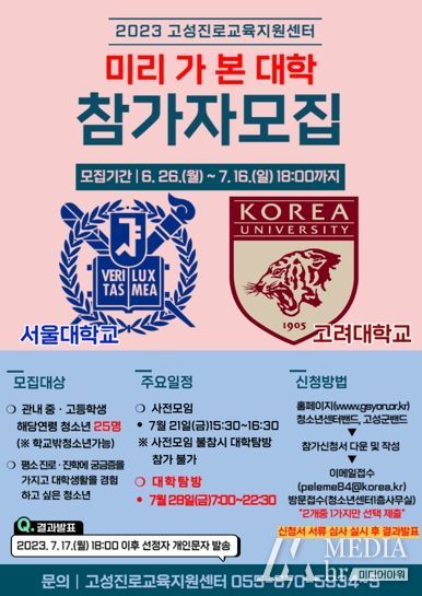 미디어아워 기자 | 고성진로교육지원센터가 지난 5월 관내 청소년 대상으로 청소년 주도의 진로 교육 프로그램을 추진하고자 실시한 욕구 조사 결과를 바탕으로 7월 28일 ‘미리 가 본 대학’ 프로그램을 진행한다.
