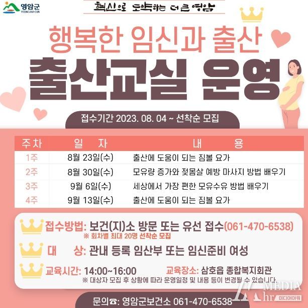 미디어아워 이다정 기자 | 영암군보건소가 이달 23일부터 매주 수요일 총 4회 운영하는 2기 ‘행복한 임신과 출산교실’ 참여자를 모집한다.