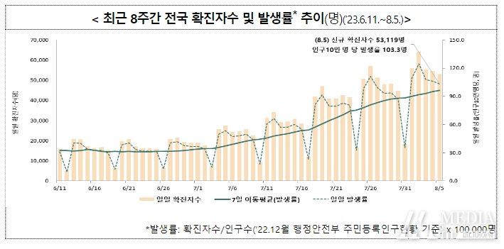 ’23년 6월4주부터 확진자 발생이 증가세로 전환하여 6주 연속 증가 중이나 8월1주 증가폭이 다소 감소했다. 감염재생산지수 역시 8월1주에 소폭 감소했다.