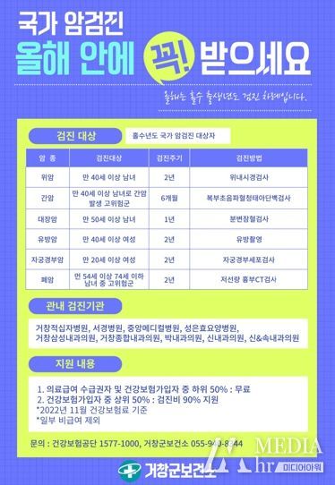 미디어아워 이다정 기자 | 거창군은 22일 우리나라 사망원인 1위인 암을 조기에 발견하고 치료율을 높이기 위해 국가 암검진을 이른 시일 내 받을 것을 군민들에게 당부했다.