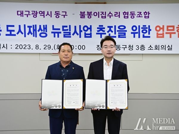 미디어아워 이다정 기자 | 대구 동구청은 지난 29일, 민관이 함께하는 성공적인 불로동 도시재생 뉴딜사업을 위해 불봉이수리소 협동조합과 업무협약을 했다.
