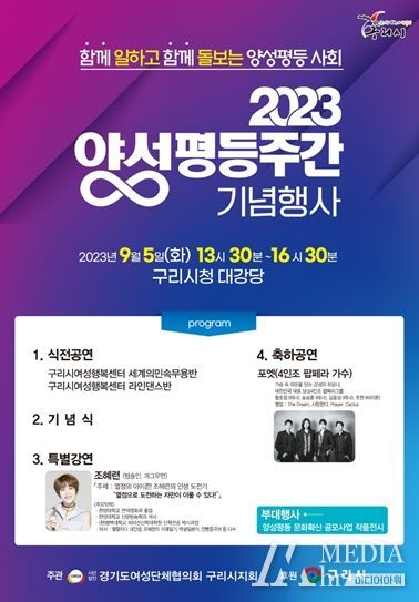 미디어아워 이다정 기자 | 구리시는 오는 9월 5일(화) 13:30 구리시청 대강당에서 (사)경기도여성단체협의회 구리시지회 주관으로 ‘2023년 양성평등주간 기념행사’를 개최한다.