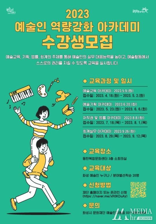 미디어아워 이다정 기자 | (재)화성시문화재단(대표이사 김신아) 예술지원센터는 ‘2023 예술인 역량강화 아카데미’의 4회차 프로그램 ‘회계실무 아카데미’ 수강생을 오는 9월 12일까지 모집한다. 해당 교육은 9월 26일 14시 동탄복합문화센터 소회의실에서 약 3시간 동안 진행 예정이다.