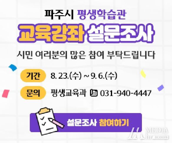 미디어아워 이다정 기자 | 파주시는 내년도 평생학습관 교육강좌 구성에 시민 의견을 반영하기 위해 9월 6일까지 설문조사를 실시한다.