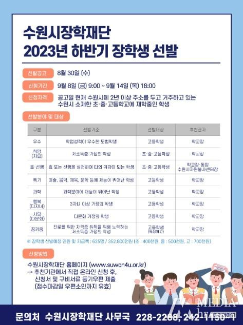 미디어아워 이다정 기자 | 수원시장학재단이 수원시 소재 초·중·고등학생을 대상으로 2023년도 하반기 장학생 625명을 선발한다.