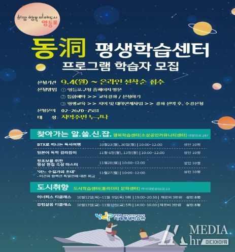 미디어아워 이다정 기자 | 영등포구가 주민들이 쉽고 편하게 평생학습을 접할 수 있도록 동네 유휴공간에서 평생학습 강좌를 제공하는 ‘동 평생학습센터’를 운영한다고 밝혔다.