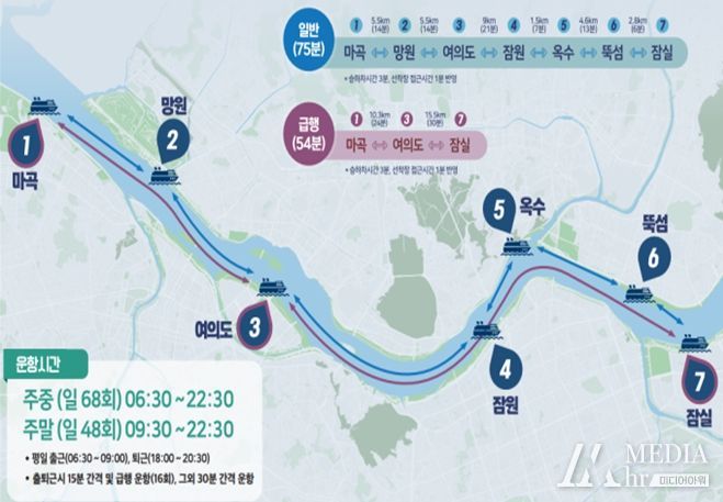 마곡·여의도·잠실 선착장 3곳만 정차하는 ‘급행노선’도 출퇴근 시간대에 16회 운항한다. 마곡에서 잠실까지 일반노선 이용 시에 75분이 소요된다면, 급행노선은 21분이 단축된 54분 만에 이동이 가능해 바쁜 출·퇴근 시간대 효율적인 이동을 돕는다.
