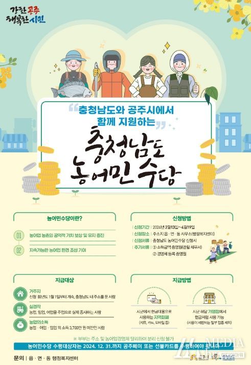 미디어아워 임다연 기자 | 공주시가 농어업인의 기본소득 보장을 위해 오는 4월 19일까지 주소지 읍면동 행정복지센터에서 농어민수당을 신청 접수한다.