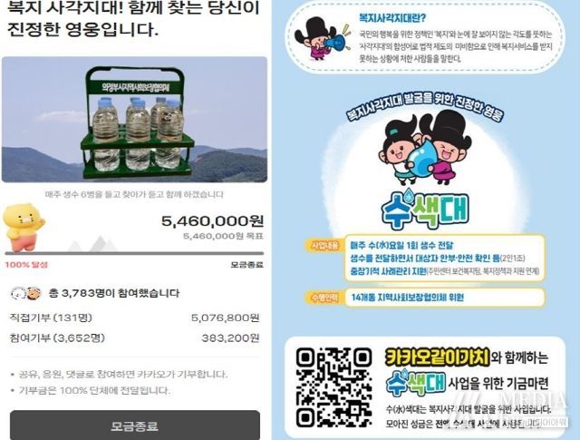 미디어아워 임다연 기자 | 의정부시는 복지 사각지대 발굴 ‘수(水)색대’ 사업을 위해 개설한 ‘카카오같이가치’ 의 모금을 100% 달성했다고 18일 밝혔다.