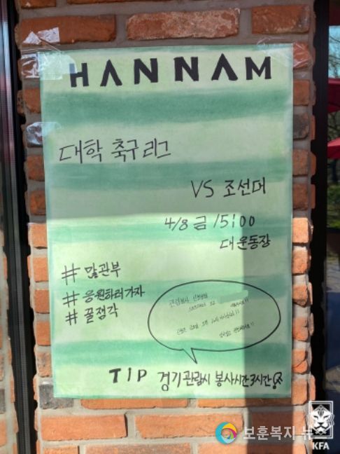벽보 제작은 코칭스태프의 아이디어다. 박규선 한남대 감독은 “선수들이 직접 홍보를 함으로써 재학생들의 관심을 유도해 응원 문화를 만들려 한다”고 말했다. 그는 “관중이 많이 올수록 선수들에게 동기부여가 될 것이다. 대학교이기 때문에 직접 포스터를 만들고 홍보할 수 있다. 이것도 선수들에게 경험이 될 것”이라며 선수들이 축구뿐만 아니라 더 넓은 시야를 갖길 바랐다.