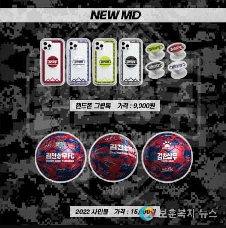 이밖에도 김천상무 유니폼 디자인을 활용한 MD들도 출시했다. 홈, 원정, GK1(연녹), GK2(검정) 디자인을 활용해 디자인한 그립톡, 마스크, 에어팟(프로), 버즈 케이스, 핸드폰 케이스를 판매한다. 그립톡은 9,000원, 마스크는 6,000원, 에어팟(프로), 버즈 케이스는 각 15,000원이다. 핸드폰 케이스의 경우 하드케이스는 19,000원, 젤리케이스는 15,000원이다.