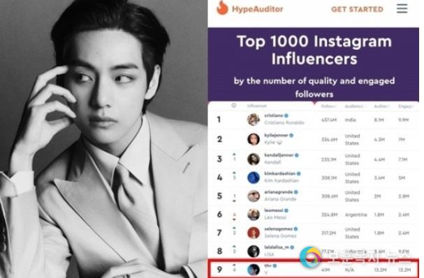 7일 인플루언서 마케팅 플랫폼 하이프오디터에 따르면, 뷔는 톱 1000 인스타그램 인플루언서 랭킹에서 한국 연예인 최초로 9위에 올랐다. 이달 초 톱10에 진입한 후 한 단계 상승했다.