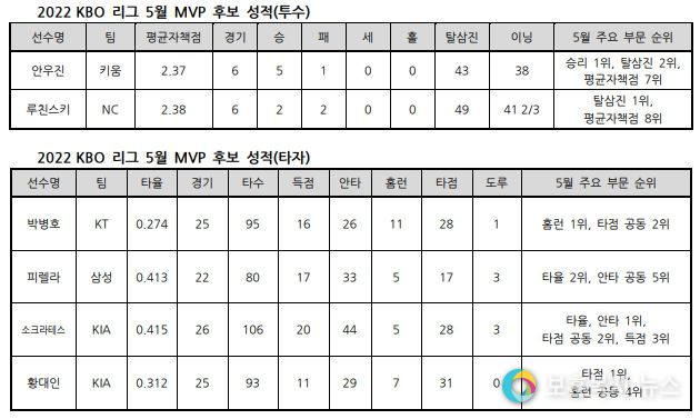 기자단 투표와 팬 투표를 합산한 2022 신한은행 SOL KBO 리그 5월 MVP 최종 결과는 오는 6월 9일(목) 발표될 예정이다.