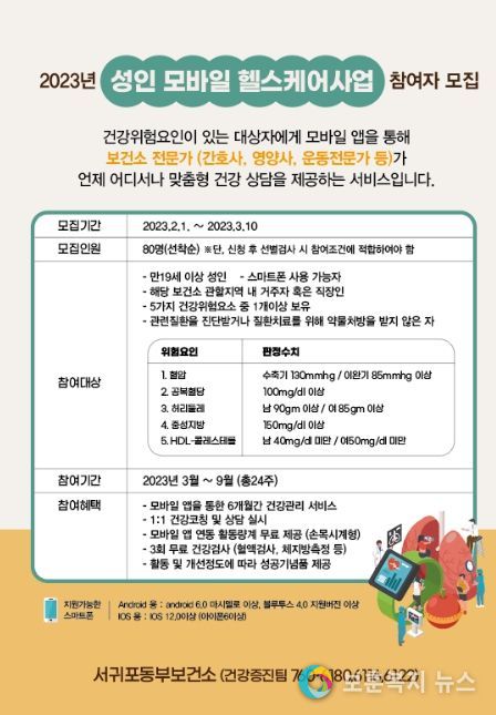 보훈복지뉴스 유서진 기자 | 서귀포시 동부보건소는 모바일 앱을 통한 건강생활 자가관리 서비스를 이용할 수 있는 모바일 헬스케어사업 참여자를 2월 1일부터 3월 10일까지 선착순으로 80명을 모집하고 있다.