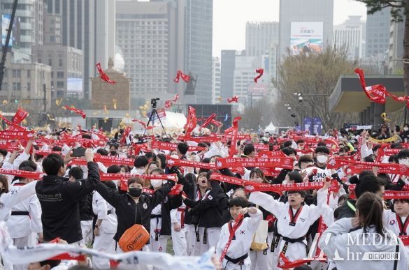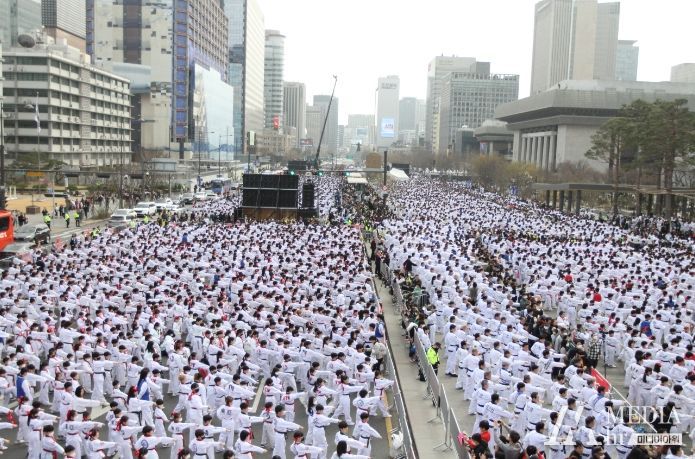 미디어아워 최태문 기자 | ‘서울의 심장’ 광화문거리가 하얀색 태권도복으로 출렁거리는 장관이 연출했다.
