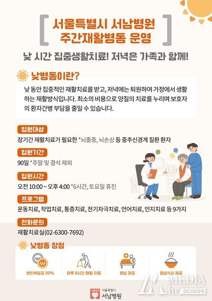미디어아워 최태문 기자 | 서울특별시 서남병원(병원장 장성희)은 장기간 재활치료가 필요한 중추신경계 환자를 대상으로 서울 서남권 공공병원 최초의 주간재활병동 시범운영을 마치고 지난 3월 정식 운영에 들어갔다.