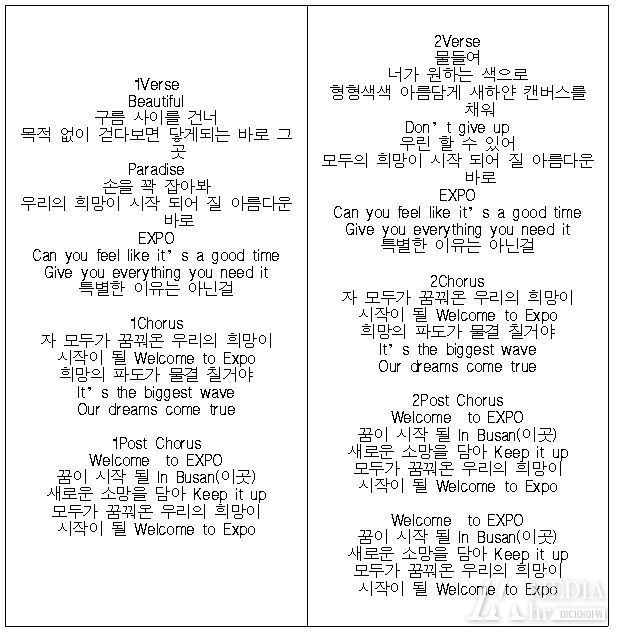 이날 공개한 엑스포 응원송은 해외에서 최근 활발하게 활동하고 있는 작곡가 그룹과 NCT, 보아 등 유명 아이돌과 함께 작업했던 프로듀서 숀 킴(Shaun Kim)이 프로듀싱과 작사를 맡았고, 노래 ‘신호등’으로 대중적인 인기를 얻고 있는 가수 이무진이 노래했다.