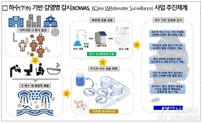 '하수(下水) 기반 감염병 감시 사업'은 전국 17개 시·도에서 선정 하수처리장(현재 전국 64개소)을 중심으로, 주 1회 이상 코로나19 바이러스, 노로 바이러스, 인플루엔자 바이러스 등 감염성 병원체를 감시할 계획이다.