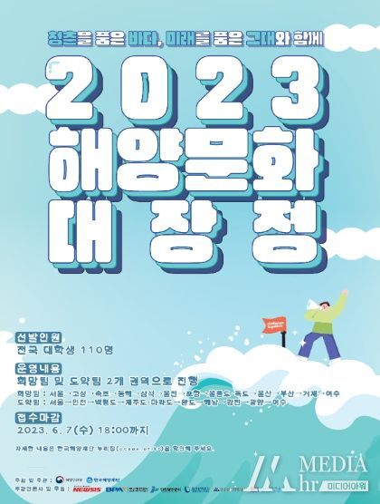 미디어아워 최태문 기자 | 해양수산부와 한국해양재단(이사장 문해남)은 4월 13일부터 6월 7일까지 ‘2023년 해양문화 대장정(이하 대장정)’ 참가자를 모집한다.