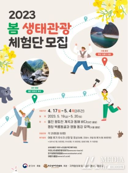 미디어아워 최태문 기자 | 환경부는 평창군, 울진군 등 천혜의 생태관광지를 1박 2일 일정으로 체험해 볼 수 있는 ‘2023년 봄철 생태관광 체험단(50명)’을 4월 17일부터 5월 4일까지 모집한다.