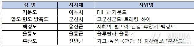 미디어아워 최태문 기자 | 문화체육관광부는 공모를 통해 ▲ 거문도(여수시), ▲ 말도․명도․방축도(군산시), ▲ 백령도(옹진군), ▲ 울릉도(울릉군), ▲ 흑산도(신안군) 5개 섬(가나다 순)을 선정, 4년 동안 섬별로 100억 원 내외를 투입해 세계인이 가고 싶은 관광명소, ‘K-관광섬’으로 육성한다.