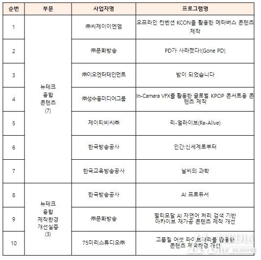 신기술(뉴테크) 융합형은 AI·가상융합 등 정보통신 신기술을 적용한 △ 방송·OTT 콘텐츠 제작을 지원하는 콘텐츠 분야와, △ 제작환경 개선 실증 분야로 구분해 선정했다. 콘텐츠 분야는 △ 온-오프라인이 연계된 가상공연과 메타버스 기술을 접목한 ‘오프라인 컨벤션 KCON을 활용한 메타버스 콘텐츠 제작(씨제이이엔엠)’, △ 사람 대신 AI 기술을 활용하여 예능 프로그램을 기획·연출하는 ‘PD가 사라졌다(문화방송)’ 등 총 7편을 지원한다. 신기술 융합 제작환경 개선 실증 분야에서는 콘텐츠 촬영·편집·유통 단계에서 인공지능, 고품질 공간 데이터 추출 등 기술을 활용해 혁신을 유도할 수 있는 3편의 과제가 선정됐다.