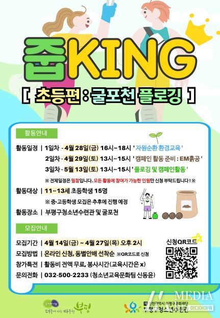 미디어아워 최태문 기자 | 부평구 청소년수련관이 오는 27일까지 지역사회 줍깅 캠페인(줍KING- 초등편:굴포천 플로깅)에 참여할 청소년 참가자를 모집한다.
