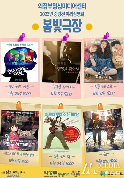 의정부영상미디어센터 중랑천 야외상영회는 야외활동이 늘어나는 요즘 ‘봄빛극장’ 이라는 타이틀을 가진 야외상영을 진행하며, 이번 봄빛극장 상영작은 '인사이드 아웃', '행복을 찾아서', '리틀 포레스트' 등 남녀노소 누구나 즐길 수 있는 영화 위주로 선정했다.