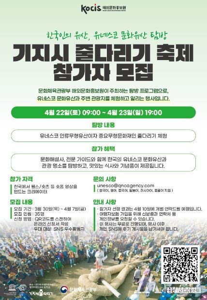 미디어아워 최태문 기자 | '오징어게임'에서 ‘276번’으로 출연했던 필리핀 배우 크리스찬 라가히트를 비롯해 주한 외국인 인플루언서(숏폼 영상 크리에이터) 35명이 4월 22일부터 23일까지 유네스코 인류무형문화유산으로 지정된 줄다리기 축제에 참여하며 K-컬처를 체험한다.